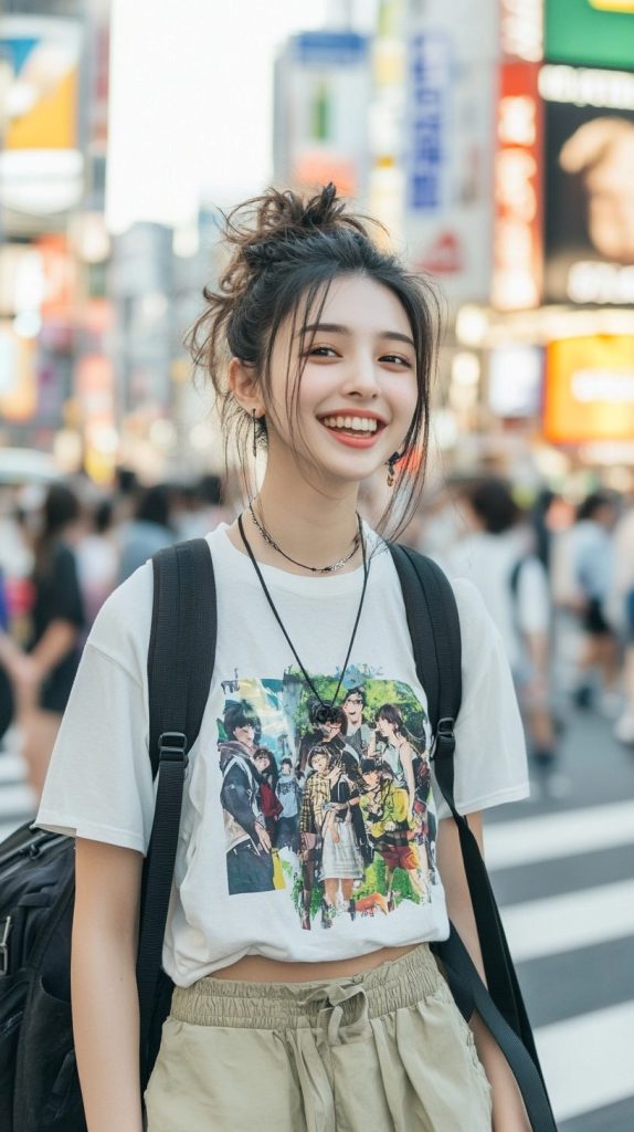 アウター:グラフィックプリント入りホワイトTシャツ(UNIQLO)