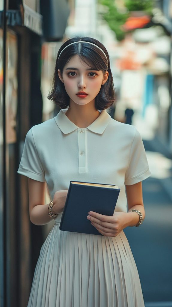 アウター:ホワイトのポロシャツ(LACOSTE) パンツ/スカート:プリーツスカート(LOWRYS FARM) アクセサリー:パールのヘッドバンドとゴールドブレスレット(LOFT) バッグ:ネイビーブックカバー付きノート(無印良品) 靴:ベージュのローファー(Clarks)