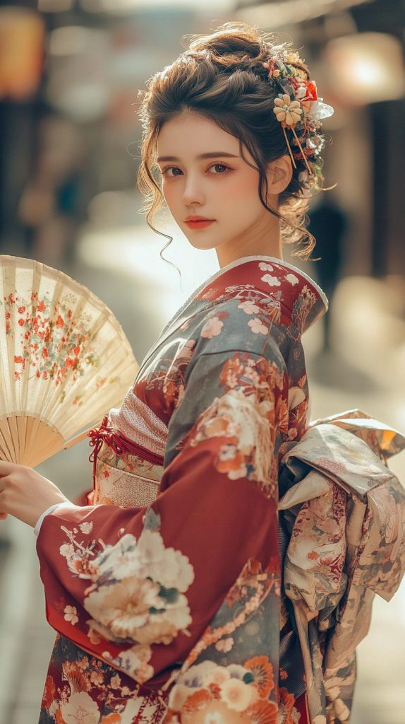 自己紹介:日本の伝統美を取り入れたデザインを追求しています。今日はインスピレーションを得るため、特別な振袖を選びました。