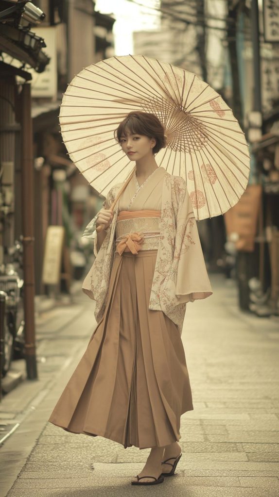 パンツ:ベージュ色の袴、「京都和装館」で誂えた特注品。柔らかな素材が特徴。