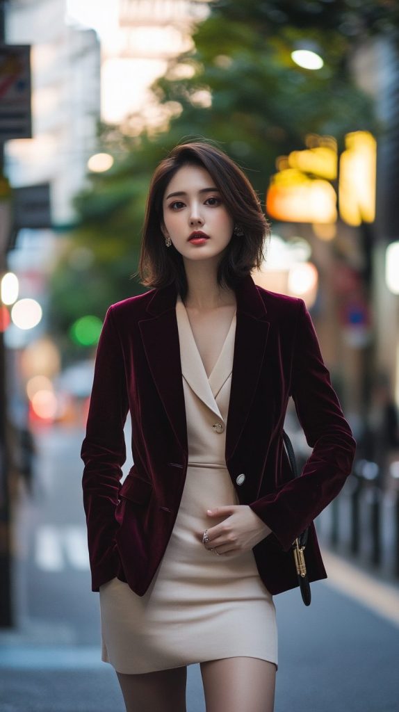 - アウター:ディープレッドのベルベットジャケット(Tom Ford)