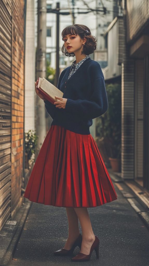 - パンツ:深紅のプリーツスカート(Miu Miu)